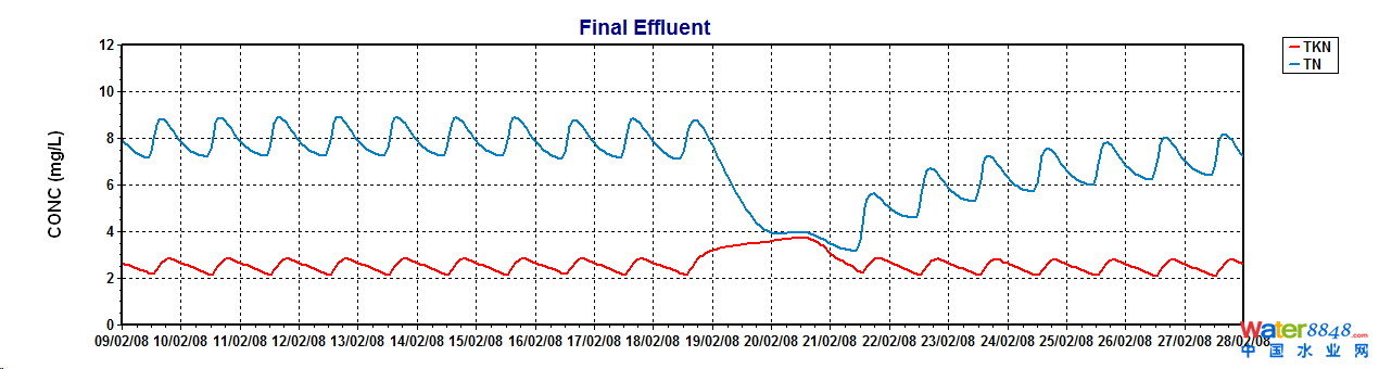 5. 模型應用工程師與建模人員制定了幾種備選的保守型升級法案,經(jīng)過在模型中使用后發(fā)現(xiàn)升級工藝中的曝氣系統(tǒng)(在氧化溝部分段增設(shè)曝氣頭)后穩(wěn)態(tài)下可以滿足提標后的要求。隨后又運用該模型對以下情景進行了動態(tài)模型: