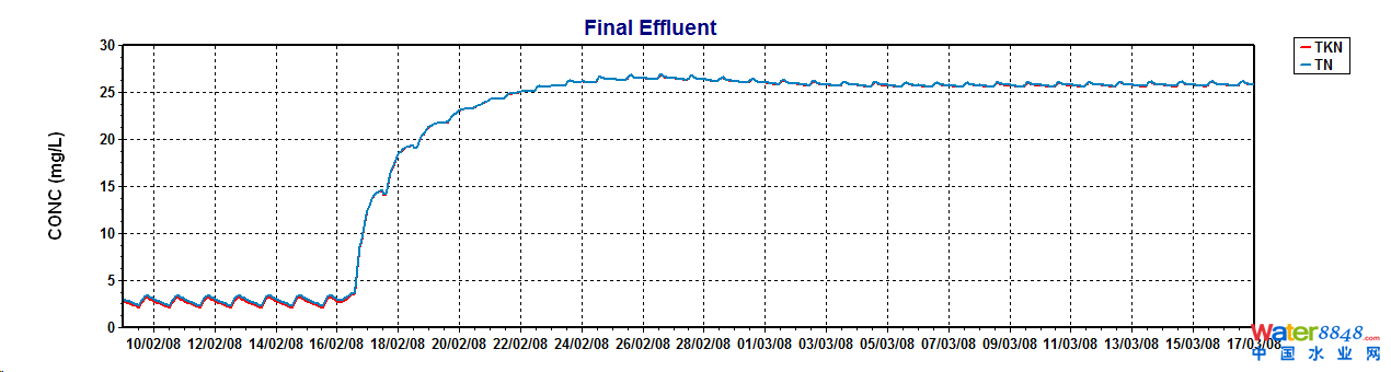 通過模型模擬及時發(fā)現(xiàn)備選升級方案的不足,除了增設(shè)曝氣頭,建議在二沉池后增加反硝化濾池進一步去除TN和TP。并建議進行進一步的模擬,在已建立的模型基礎(chǔ)上考察新設(shè)計或新方案的有效性。