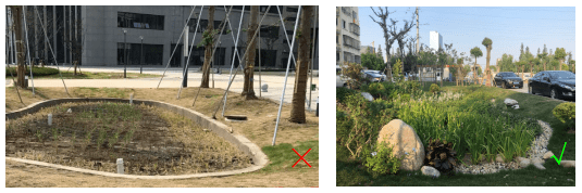 種植不同于普通綠化,宜采用長(zhǎng)勢(shì)較好、規(guī)格較高的全株苗(容器苗),同時(shí)應(yīng)避免過(guò)度修剪;生物滯留池應(yīng)適當(dāng)提高植物的種植密度,建議在常規(guī)種植密度基礎(chǔ)上提高20%,保證不露土。豐富植物品種,采用組團(tuán)式種植方式,避免散種造成池內(nèi)植物散亂。采用片植、群植、叢植、孤植相結(jié)合的布局形式,疏密結(jié)合,兼顧觀賞和休憩功能,避免散種造成池內(nèi)植物散亂。夏季種植完畢每日均需要進(jìn)行澆灌,保證植物成活。