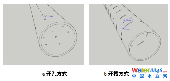 考慮到排水層采用粗圓、角礫石進(jìn)行鋪設(shè),排水層介質(zhì)粒徑控制在10 ~20 mm,要求排水層最小粒徑不得小于排水盲管開(kāi)孔孔徑的1.5倍,開(kāi)孔率調(diào)整至0.5% ~1%,采用圓形開(kāi)孔時(shí),開(kāi)孔孔徑4 ~6mm,詳見(jiàn)圖10(a);采用槽狀開(kāi)口時(shí),槽寬2 ~3 mm,槽長(zhǎng)20 ~30 mm,詳見(jiàn)圖10(b),間距按照流量要求、開(kāi)孔(槽)尺寸、橫截面孔(槽)口數(shù)量計(jì)算確定。