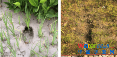 現(xiàn)場(chǎng)施工后經(jīng)常出現(xiàn)降雨后,由于排水盲管孔徑大、結(jié)構(gòu)層粒徑匹配不夠,回填介質(zhì)層的流失會(huì)在生物滯留池表面上留下“凹陷”,并堵塞盲管,見(jiàn)圖9。