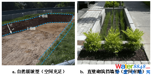 場(chǎng)地條件地允許的情況下,例如小區(qū)綠地、公園等,生物滯留池建議采用自然緩坡型,如圖4(a)所示。在場(chǎng)地條件有限的情況下,例如道路、停車(chē)場(chǎng)的綠化帶,側(cè)石所對(duì)應(yīng)的邊緣可直接作為生物滯留池的硬質(zhì)護(hù)坡,放樣時(shí)生物滯留池邊界以道路、鋪裝邊線(xiàn)為界,如圖4(b)所示。