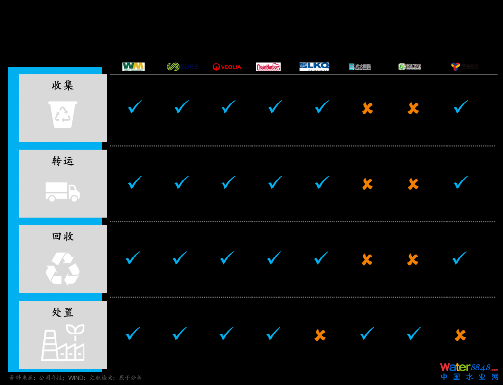進(jìn)一步研究發(fā)現(xiàn),成熟市場下的國外巨頭WM、RSG、蘇伊士、威立雅、CLH、LKQ等大多選擇了全產(chǎn)業(yè)鏈模式,致力于打造從收集到轉(zhuǎn)運(yùn)、回收、處置的一站式服務(wù)能力(圖10)。