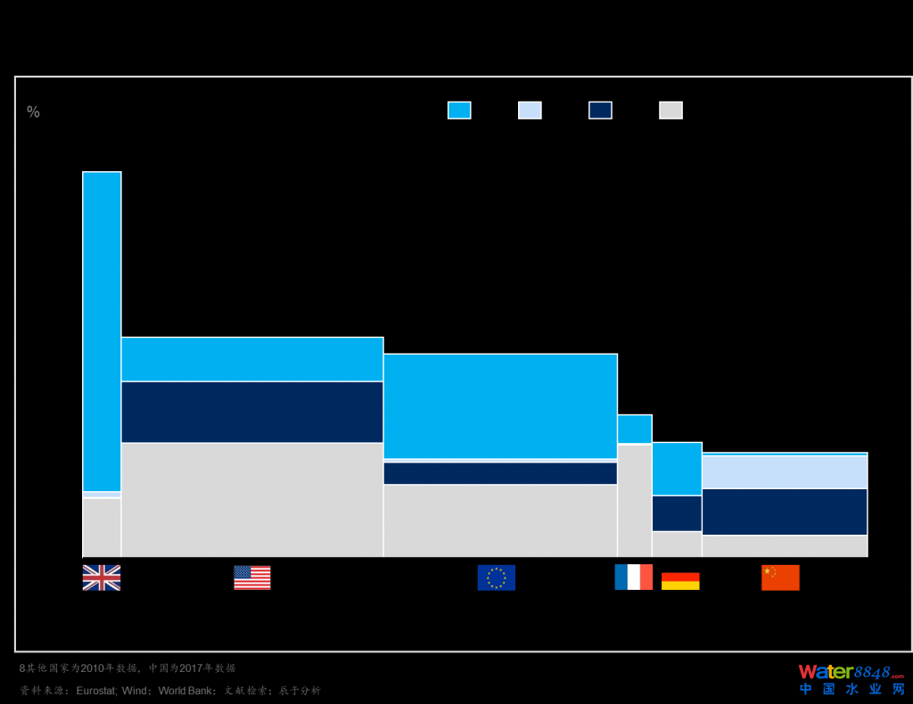 從供給角度看,中國固廢行業(yè)的政府投入明顯不足,具體體現(xiàn)在“兩低”:一是與其他發(fā)達(dá)國家相比,中國政府環(huán)境治理支出2017年占GDP的比重為0.23%,仍低于2010年英國的0.84%、美國的0.48%、法國的0.31%、德國的0.25%以及歐盟整體的0.44%;二是中國政府環(huán)境治理支出主要集中在水務(wù)和大氣,固廢治理支出尚不足5%,遠(yuǎn)低于2010年英國的80%、美國的20%、法國的20%、德國的46%以及歐盟整體的52%(見圖3)。
