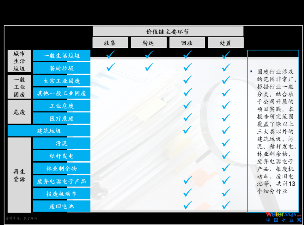 《中華人民共和國固體廢物污染環(huán)境防治法》把固體廢物分為三大類,包括工業(yè)固體廢物、城市生活垃圾和危險廢物。根據(jù)一般分類,結(jié)合辰于公司近三年開展的咨詢項(xiàng)目實(shí)踐,本報(bào)告研究范圍覆蓋了除以上三大類以外的建筑垃圾、再生資源(包括污泥、秸稈發(fā)電、林業(yè)剩余物、廢棄電器電子產(chǎn)品、報(bào)廢機(jī)動車、廢舊電池)等,共計(jì)13個細(xì)分行業(yè)(見圖1).