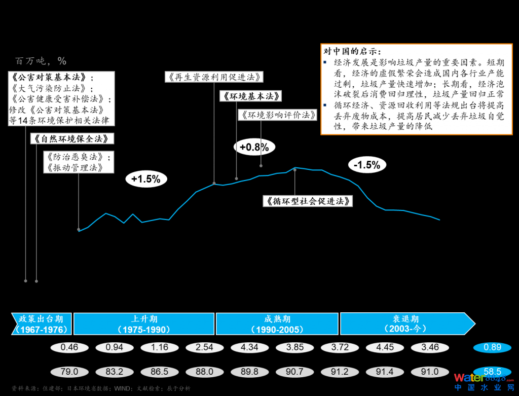 美國、歐洲及日本的經(jīng)驗(yàn)表明,首部政策出臺30~35年左右,固廢行業(yè)增速開始放緩(見圖5、圖6)。中國在1995年頒布了固廢行業(yè)首部法規(guī)《固體廢物污染環(huán)境防治法》,結(jié)合中國城鎮(zhèn)化率以及人均GDP的變化趨勢,我們判斷這一輪高速增長將一直持續(xù)到2030年,未來十年將是中國固廢行業(yè)最后沖刺的“黃金時期”。