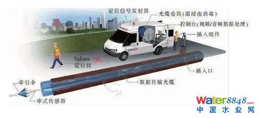 管道漏點修復(fù)工作取決且受限于對管道漏點數(shù)量和位置的預(yù)判,因此,準(zhǔn)確判斷漏點的數(shù)量和位置極為重要。因漏點所在供水管道埋深大,且又位于快速路下,傳統(tǒng)人工聽漏技術(shù)無法發(fā)揮作用,因此,選用了Sahara Ⅱ管網(wǎng)檢測新技術(shù),這是一項基于聲學(xué)的無損狀態(tài)評估檢測技術(shù),可在不影響管網(wǎng)正常供水運營的狀態(tài)下,通過視頻和聲吶對管道漏損部位進(jìn)行檢測定位。