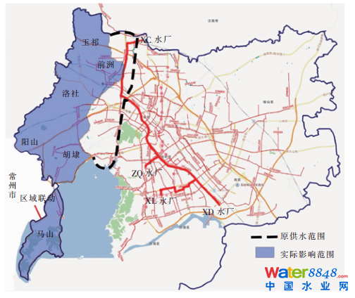為減少搶修期間對居民用水的影響,制定了應(yīng)急調(diào)度方案,主要包括兩個方面:①充分利用供水高速通道(大口徑DN2 400清水管道,連通城市主力在供水廠)的轉(zhuǎn)輸能力,由南部水廠彌補北邊不足的水量;再打開所有往西供水的管道溝通閥門,盡可能減少、減輕用水影響范圍和影響程度。②積極溝通,進(jìn)行區(qū)域聯(lián)動;西南部馬山片區(qū)離主力在供水廠較遠(yuǎn),屬于供水邊緣地區(qū),日常主要由西線保障供水,應(yīng)急時可開啟常州往馬山方向的DN500供水管上閥門,實現(xiàn)聯(lián)網(wǎng)通水。