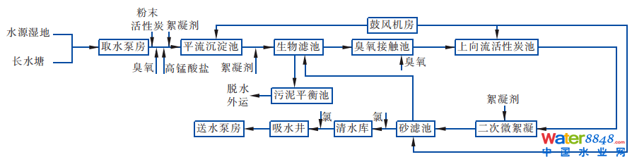 貫涇港水廠二期工藝是多年工程經(jīng)驗(yàn)和理論研究的成果,從流程圖上看,工藝偏長,但從工藝內(nèi)在的邏輯性分析可以看出其主要的技術(shù)思路。