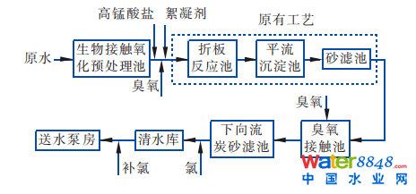 圖3 生物預(yù)處理+強(qiáng)化常規(guī)處理+深度處理工藝流程