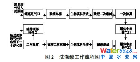 4.1惡臭廢氣從洗滌罐的底部進(jìn)入罐體,先經(jīng)過(guò)酸液生物膜填料層洗滌,經(jīng)過(guò)洗滌,惡臭廢氣中的堿性成份被吸收;