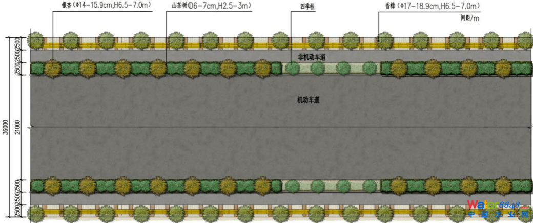 但全線路段的技術(shù)標(biāo)準(zhǔn)、斷面形式一樣,道路紅線36m,為雙向6車道(每個(gè)車道3.5m,路面總寬度21米),兩側(cè)人行道、自行車道、綠化帶各2.5m共計(jì)7.5m。