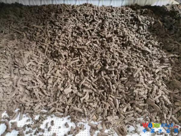 深度脫水后含水率60%左右的污泥在帶式熱泵低溫干化設(shè)備的入口經(jīng)面條機(jī)擠壓成約4~6mm直徑的圓柱條狀,再進(jìn)入網(wǎng)帶連續(xù)低溫除濕干燥箱。在網(wǎng)帶運(yùn)轉(zhuǎn)污泥緩緩轉(zhuǎn)運(yùn)過程中,圓柱條狀的深度脫水污泥均勻攤鋪在網(wǎng)帶輸送機(jī)上。60~70℃的熱空氣從網(wǎng)帶下方經(jīng)網(wǎng)眼向上通過,使污泥與熱空氣產(chǎn)生熱質(zhì)交換,從而將污泥中水分蒸發(fā)帶出。吸收了污泥中水分的40~50℃濕熱空氣再進(jìn)入除濕熱泵中進(jìn)行除濕與加熱處理,處理后熱干空氣循環(huán)對(duì)網(wǎng)帶上污泥進(jìn)行干化,干化后污泥外觀如圖4呈直徑4mm左右的細(xì)顆粒狀,干化后污泥含水率降低至40%以下,最后與垃圾摻燒處置。