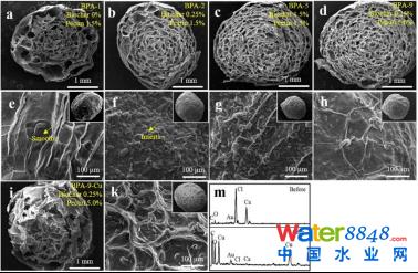 作為功能填料,生物炭的含O特征、堿性表面特征以及多孔結(jié)構(gòu)可能對復(fù)合凝膠球的吸附性能等方面帶來一些積極的效應(yīng);诖耍瑢χ苽涞牟牧霞捌湮街亟饘偾昂筮M(jìn)行了形貌和組成分析(見圖2 ),其主要特征包括:BPA復(fù)合凝膠球內(nèi)部呈多孔結(jié)構(gòu);同時(shí),隨著生物炭和果膠劑量的增加,內(nèi)部交聯(lián)密度變大;生物炭的摻入使其表面變得粗糙;可通過組分比例不同進(jìn)行進(jìn)一步調(diào)節(jié)。