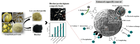 由于水凝膠的物理化學(xué)特性的相互依賴,在凝膠網(wǎng)絡(luò)中引入包埋填料,不僅可以明顯地改變其網(wǎng)絡(luò)結(jié)構(gòu)特征,而且可能提升其在某些特定環(huán)境中的應(yīng)用潛力。為進(jìn)一步提高多糖基凝膠的吸附性能和機(jī)械強(qiáng)度等特性,該研究采用多元共混和包埋改性的策略,以柚子皮熱解得到的生物炭作為功能填料;同時(shí)利用柚子皮中提取的低酯化度果膠與海藻酸鈉共混作為凝膠網(wǎng)絡(luò)基質(zhì),開發(fā)制備了多元共混的生物炭/果膠/海藻酸鈉 復(fù)合凝膠球,并用于水中Cu 2+的強(qiáng)化吸附。研究結(jié)果表明,三組分合成的復(fù)合凝膠球的吸附性能優(yōu)于其它種類的單組分或者雙組分的凝膠球;當(dāng)?shù)孜?/span>SA 濃度固定0.5%( W/V) ,果膠與海藻酸鹽的質(zhì)量比為10:1,生物炭與海藻酸鈉的質(zhì)量比為0.5:1 時(shí),制備的復(fù)合凝膠球BPA-9具有較好的吸附性能和較強(qiáng)的抗壓強(qiáng)度。無機(jī)鹽對凝膠球吸附Cu 2+的干擾依次為CaCl 2>MgCl2>NaCl ,有機(jī)配體的干擾影響為EDTA-2Na<CA ,并且均保持較好的Cu(Ⅱ) 的吸附性能。對水中不同金屬離子的去除效果依次為Fe(III)>Pb(II)> Cu(Ⅱ)>Cd(Ⅱ)>Zn(Ⅱ)>Ni(Ⅱ)>Mn(Ⅱ) ,其中對Fe(Ⅲ) 的去除主要是吸附和絮凝-沉淀共同作用。陽離子交換、絡(luò)合、還原反應(yīng)、Cu-π 鍵和沉淀以及多孔效應(yīng)共同作用于BPA-9對Cu 2+的強(qiáng)化吸附。底物組分的活性基團(tuán),局部pH調(diào)控以及多孔效應(yīng)所形成的協(xié)同效應(yīng)強(qiáng)化了吸附效果。聚合物分子和生物炭之間較強(qiáng)的界面相互作用(共交聯(lián)以及氫鍵),能有效改善復(fù)合凝膠球的機(jī)械、熱穩(wěn)定性能。