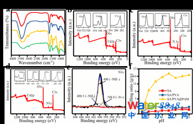 圖3 ( a) SA、P VA/SA、P VA/SA@PAM-1.0和P VA/SA@PAM-1.0-Cu的紅外圖譜,( b) PVA/SA、P VA/SA@PAM-1.0 (c)吸附前和( d)吸附后全譜圖,(e) PVA/SA@PAM-1.0吸附后N 1s的高分辨圖和( f)不同pH條件對 SA、P VA/SA和PVA/SA@PAM-1.0凝膠球溶脹特性的影響