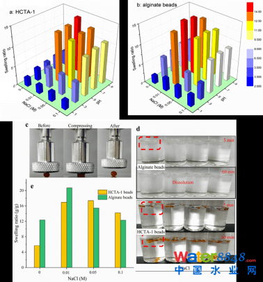 圖3 不同pH(1–9)、NaCl(0~0.1mol/L)條件下,(a)HCTA-1凝膠球以及( b)海藻酸鹽凝膠球的溶脹性能,( c) HCTA-1凝膠球在0.1mol/L NaCl( pH 11)中浸泡24 h后的抗壓測試,(d)在0.1mol/L NaCl(p H 13)中浸泡的HCTA-1和海藻酸鹽凝膠球不同時(shí)間間隔下圖像,(e)不同NaCl濃度(0 ~0.1mol/L)、pH 11條件下,HCTA-1和海藻酸鹽凝膠球24h后的溶脹率