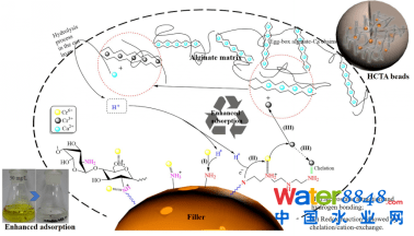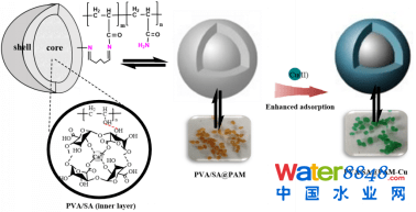 如圖4所示,在PVA/SA凝膠球上引入PAM后,強(qiáng)化的吸附效果關(guān)鍵在于吸附質(zhì)與氨基發(fā)生絡(luò)合作用。Cu 2+離子最初通過外層的PAM被吸引,然后逐漸進(jìn)入內(nèi)層(即PVA/SA部分),從而充分利用PAM。