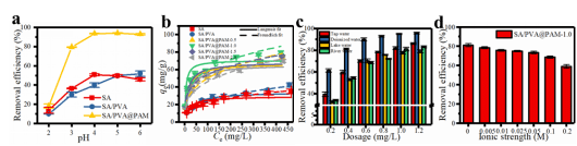 圖2 (a) pH對S A,PV/SA,PVA/SA@PAM-1.0凝膠球吸附Cu2+性能影響,( b)不同吸附劑對Cu2+的吸附等溫線,( c) PVA/SA@PAM-1.0在不同水環(huán)境下吸附C u2+,(d) PVA/SA@PAM-1.0對Cu (Ⅱ)的吸附可重復(fù)利用性