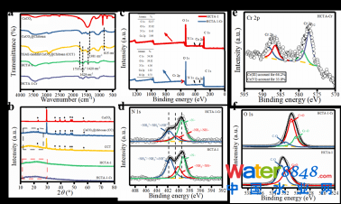 圖2 CaCO3、CaCO3@chitosan (CC)、CCT 以及HCTA-1吸附前后的( a) FTIR圖和( b) XRD圖,HCTA-1吸附前后的( c)廣譜X PS圖,吸附后H CTA-1-Cr的(d) N 1s、(e) Cr 2p、( f) O 1s XPS圖