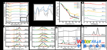 圖3 ( a)生物炭、果膠、不同B PA吸附前以及( b) BPA-9吸附后對應(yīng)的紅外光譜,(c)不同組分比例的BPA凝膠球的T G曲線,( d)不同組分比例的B PA凝膠球以及B PA-9吸附后的X RD圖,不同組分比例BPA凝膠球吸附前后的(e) C1s、(f) O 1s、(g) Ca2p和(h) Cu2p的XPS圖