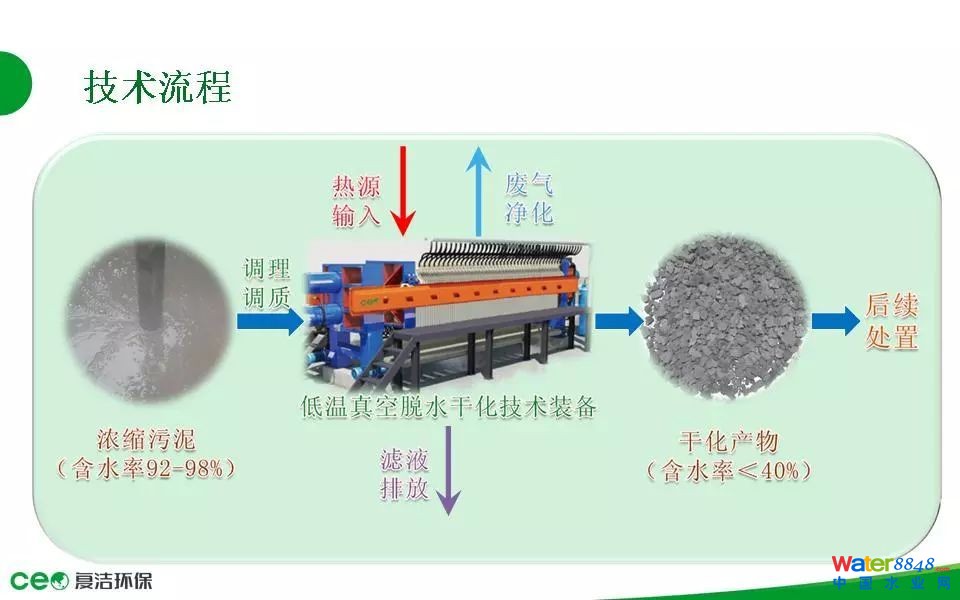 基于現(xiàn)狀,我們在2008年的時候把“脫水和干化能不能結(jié)合在一套工藝當(dāng)中完成?”作為我們當(dāng)時技術(shù)的理念,開發(fā)出了低溫真空脫水干化成套技術(shù)裝備,把污泥的脫水和干化在一套工藝設(shè)備中連續(xù)完成。在這工藝中,我們從濃縮污泥開始,含水率一般為90%到99%左右,這樣的污泥通過調(diào)理調(diào)質(zhì),進(jìn)入我們有點類似于板框壓濾機的設(shè)備,同時輸入熱源,因為干化肯定是需要熱源的。同時排放出濾液,還有一些廢氣的排放,最終產(chǎn)出了含水率40%以下的干化產(chǎn)物。我們結(jié)合項目本身的性質(zhì),比如工業(yè)上危廢污泥干化要求比較高,通常做到20%以下,化工產(chǎn)品當(dāng)中我們做到干化后含水率2%以下。