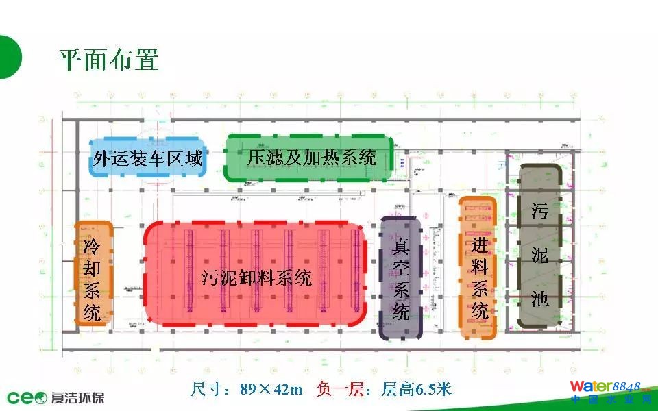 平面布置這塊,我們系統(tǒng)設(shè)備地下有一部分,地面上有一部分,地面層整個占地89×42米,層高10.9米,主要有主機部分,污泥濃縮,包括除臭,還有調(diào)質(zhì)以及整個控制間。這是底下層,也就是負(fù)一層,占地尺寸是一樣的,底下標(biāo)高稍微矮一點,大約6.5米。這里面主要包括污泥的卸料系統(tǒng),還有壓濾加熱系統(tǒng),這是我們重點區(qū)域的一些功能。我們整個項目當(dāng)中采用的BIM做的設(shè)計,因為這個項目是地下結(jié)構(gòu),很多設(shè)計包括施工必須要前期考慮的更多,否則后續(xù)的土建和管道沒法進(jìn)行變更的,所以當(dāng)時進(jìn)行了大量的BIM模型設(shè)計。