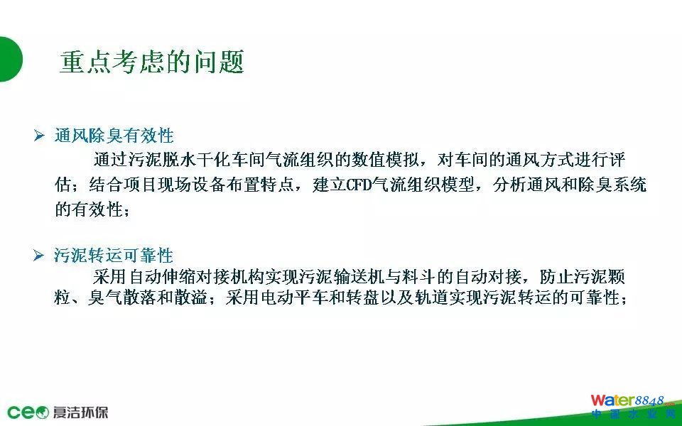 針對地下式污水處理廠重點考慮的問題主要有兩點,第一重點是通風(fēng)除臭的有效性,通過污泥脫水干化車間氣流組織的數(shù)值模擬,對車間的通風(fēng)方式進(jìn)行評估,根據(jù)項目現(xiàn)場設(shè)備布置特點,建立CFD氣流組織模型,分析通風(fēng)和除臭系統(tǒng)的有效性。從目前調(diào)試運行的情況來看,效果相當(dāng)理想。第二重點是考慮污泥怎么從地下能夠轉(zhuǎn)運到地面上,污泥的轉(zhuǎn)運可靠性也是我們重點考慮的。這過程中我們采用了全封閉,自動伸縮對接機構(gòu),必須考慮對接的有效性,同時防止污泥,包括臭氣有逸散的情況。因為地下空間有限,必須用電動平車和轉(zhuǎn)盤以及軌道實現(xiàn)污泥轉(zhuǎn)運的可靠性。目前這個系統(tǒng)還在調(diào)試過程,污泥量有限,所以還未進(jìn)行連續(xù)的測試。