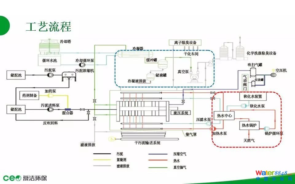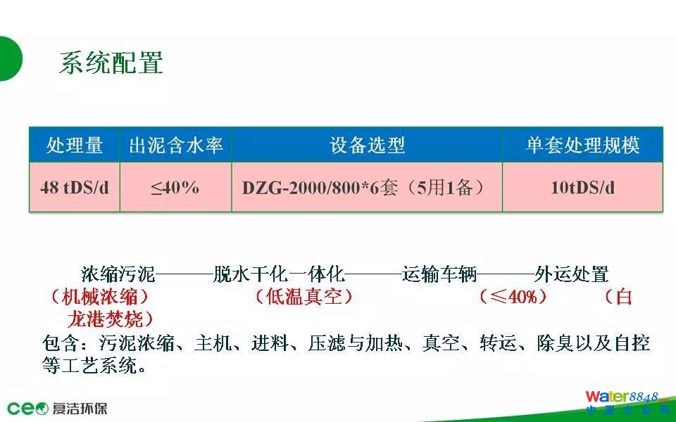 這是他們整個廠的污水處理的流程,我們主要處理的污泥來源一個是剩余污泥,還有高效沉淀以后的物化污泥,這兩個污泥直接到污泥儲池,含水率在99.2%左右。整個干基泥量是48噸,從機械濃縮開始,經(jīng)過脫水干化一體化的工藝,最后40%的污泥要運到白龍港進(jìn)行焚燒,整套系統(tǒng)包括了濃縮、主機、進(jìn)料、壓濾加熱、真空、轉(zhuǎn)運、除臭,以及自控等工藝系統(tǒng)。