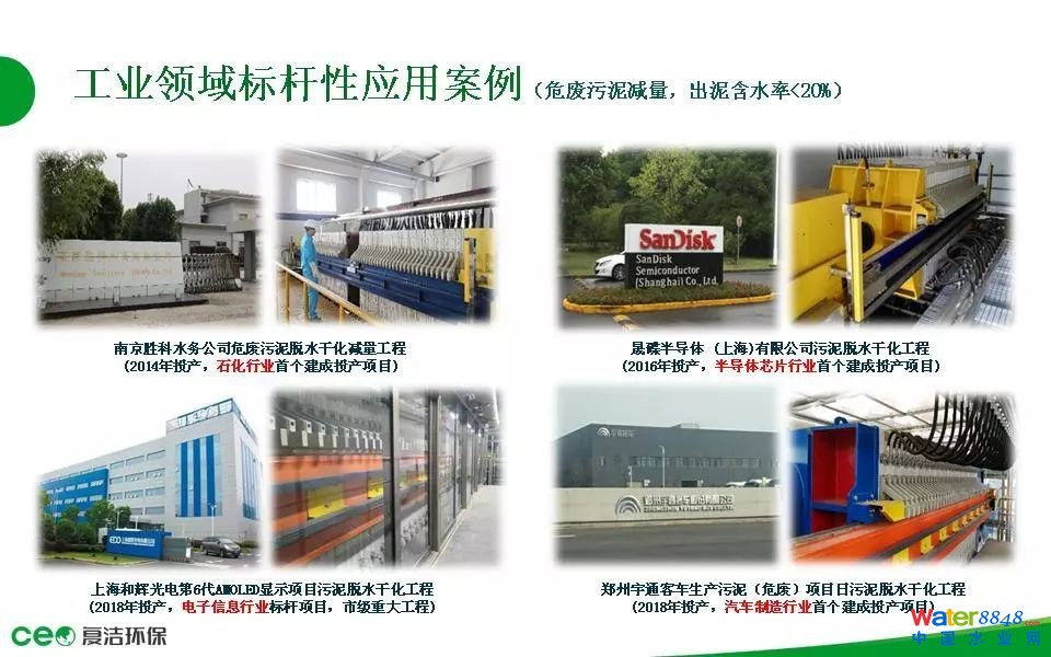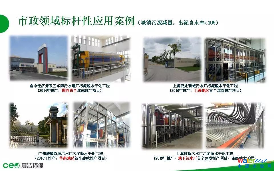 最后再看一下幾個市政領(lǐng)域標(biāo)桿性的應(yīng)用案例,第一個項目應(yīng)用在2014年,南京首個投產(chǎn)的市政項目;2016年在上海首個投產(chǎn)的污泥脫水干化項目;這個是我們在華南地區(qū)廣州首個建成投產(chǎn)的項目;這是我們2019年虹橋地下式污水處理廠項目。