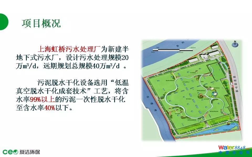 接下來,我重點分享一下在上海做的虹橋污水處理廠污泥深度處理的項目,大家看一下效果圖,現(xiàn)在已經(jīng)建成了,目前處在調(diào)試階段。這個項目是新建的,半地下式的污水處理廠,設(shè)計的規(guī)模近期20萬噸,遠(yuǎn)期40萬噸每天。污泥的脫水干化設(shè)備選擇低溫真空脫水干化成套技術(shù)裝備,從99%的含水率污泥一次性降低到40%以下的要求。