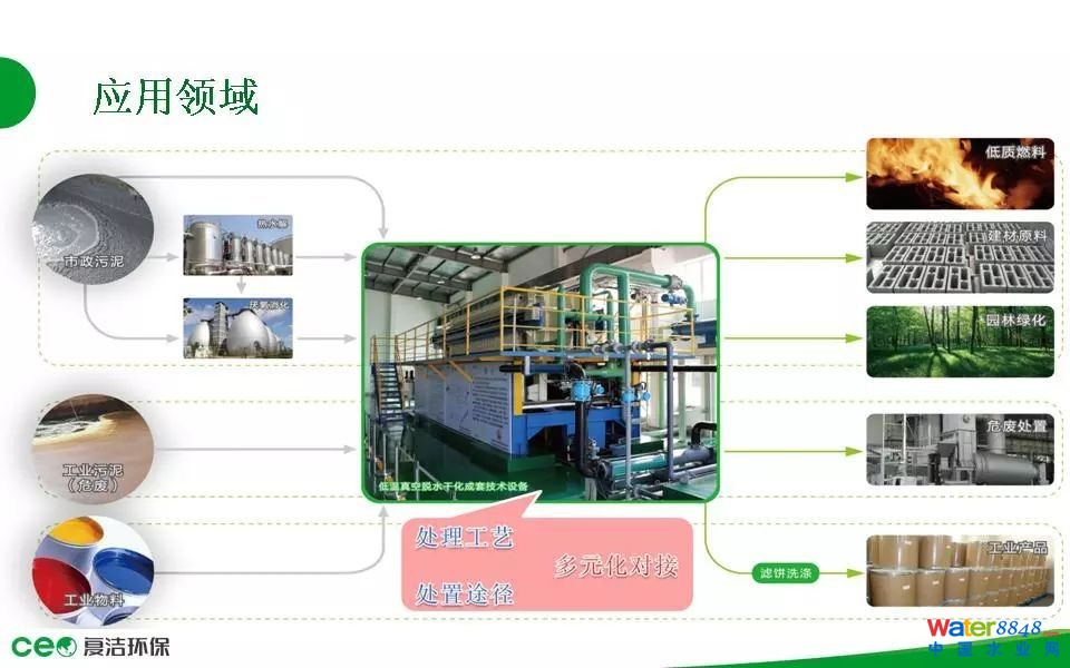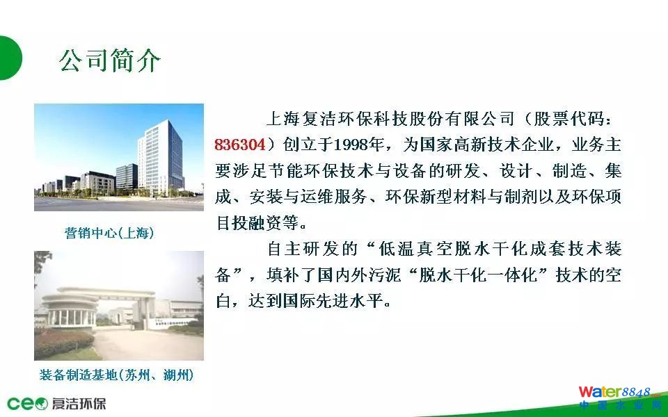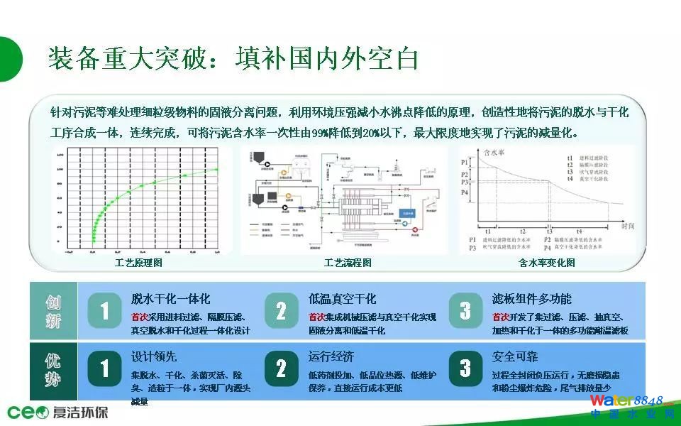 公司是1998年成立的,目前在新三板掛牌,自主研發(fā)的低溫真空水脫水干化成套技術(shù)裝備是08年立項的,填補了國內(nèi)外污泥脫水干化一體化的技術(shù)空白,達(dá)到了國際先進(jìn)水平。我們公司的業(yè)務(wù)重點在兩個領(lǐng)域,一塊是污泥領(lǐng)域,還有一塊是廢氣治理領(lǐng)域。市政領(lǐng)域我們主要針對污水廠污水處理本身的臭氣治理,還有污泥的脫水干化;工業(yè)領(lǐng)域我們主要針對危廢污泥,還有VOC有機廢氣的高效新型凈化技術(shù)。