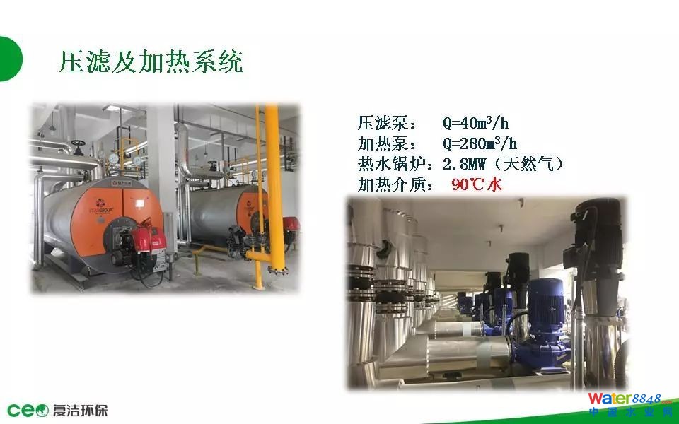 這個系統(tǒng)濃縮部分用的是離心機,把污泥的含固率提高到4-5%左右。這是我們的主機部分,總共有6臺設(shè)備,這些濾板能夠耐120度以下的高溫,也是我們真正進(jìn)入脫水和干化的關(guān)鍵環(huán)節(jié)。這是進(jìn)料泵和加藥泵,加藥量為干基的千分之1到1.5,這是我們配的壓濾泵和加熱泵以及常壓熱水鍋爐,加熱的介質(zhì)為90度的熱水。這是真空泵,主要是使系統(tǒng)內(nèi)部形成負(fù)壓,然后把出來的氣水混合物混合物抽出來。
