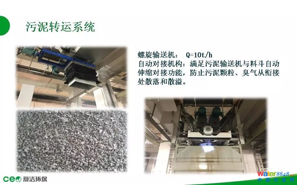 這是螺旋輸送機,因為是地下結(jié)構(gòu),很多的工藝處理,包括銜接上,物料的防散落和臭氣的防泄漏都是我們重點考慮的。這個項目在板框壓濾機下部配的是雙軸螺旋輸送機,底下配的是自動對接機構(gòu),完全滿足污泥輸送機與料斗自動伸縮對接功能。裝料車到位以后,光電信號給對接機構(gòu),對接機構(gòu)馬上下降,對準(zhǔn)料斗,包括它的動力、抽氣都是和我們的系統(tǒng)完全對接。這是我們目前排出來污泥的情況。