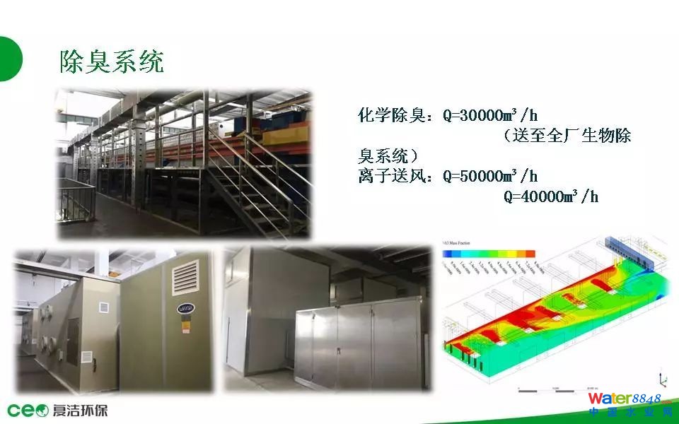 這是除臭系統(tǒng),我們最后的臭氣進(jìn)入整廠的生物除臭,我們就地采取的是化學(xué)除臭。另外我們對空間的操作環(huán)境進(jìn)行離子送風(fēng)除臭,這當(dāng)中進(jìn)行了大量的氣流組織模擬的工作。