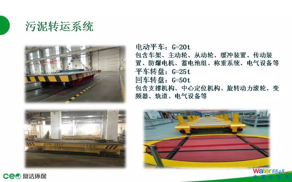 電動平車,這是污泥轉(zhuǎn)運系統(tǒng)的一部分,因為是地下結(jié)構(gòu),車輛包括各方面的運輸,包括走的道路都是受限制的,在這個項目當(dāng)中我們是采用了電動平車,包括了平車轉(zhuǎn)盤和回車轉(zhuǎn)盤,使我們每個設(shè)備底下的料斗和外運的車能夠很有效地進(jìn)行銜接,經(jīng)過了我們大量的測試工作,證明是安全可靠的。