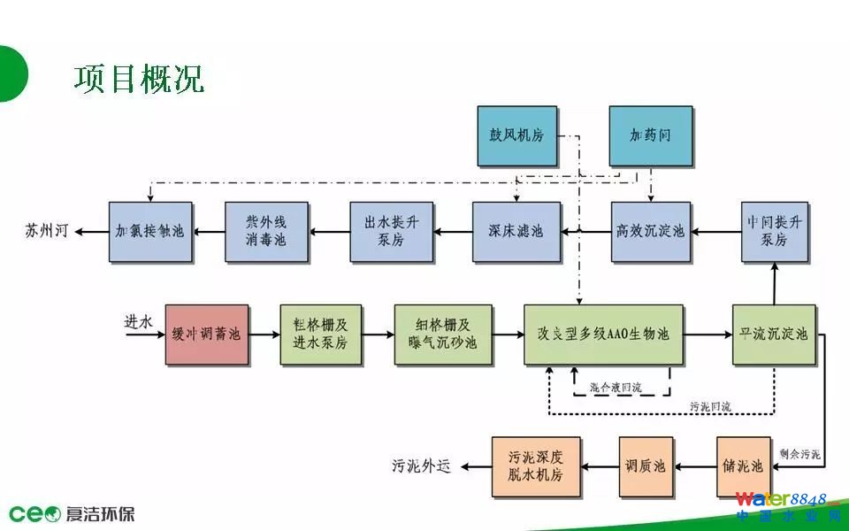 這是這個項目的典型流程圖,我們的污泥從儲池開始,經(jīng)過離心機機械濃縮,最后是污泥外運出去。這里面我們采用了化學(xué)除臭,還有離子除臭的設(shè)備。