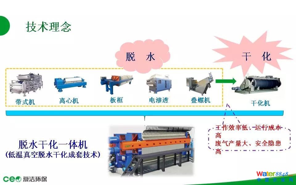 我們再回顧一下低溫真空脫水干化成套技術(shù)裝備的情況,傳統(tǒng)的污泥脫水分成兩個部分,先脫水,再干化,常規(guī)用的是帶式機、離心機、板框、電滲透,還有這幾年發(fā)展比較快的用在市政上的疊螺機,脫水到含水率60%到85%之間;要進(jìn)一步處置則需要對污泥進(jìn)行干化,再配一個干化機,整體效率比較低,運營成本很高,這過程包括脫水、干化,廢氣產(chǎn)生量相當(dāng)大。而且在后續(xù)的干化過程中存在很大的安全隱患,這個隱患主要包括廢氣本身,還有一個是磨損,或者是粉塵爆炸方面的一些問題。