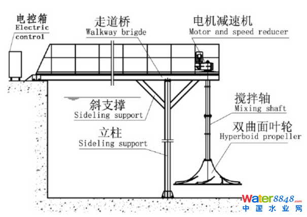 圖一為干式安裝,通過(guò)橋架將減速電機(jī)定位在水池上方,由傳動(dòng)軸將動(dòng)力傳遞給水下的雙曲面葉輪,傳動(dòng)軸的長(zhǎng)度根據(jù)池深而定,一般葉輪離池底約300mm。