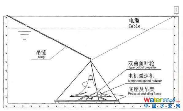 圖二為潛水式安裝,它由潛水電機(jī)、雙曲面葉輪和吊裝附件組成。利用潛水電機(jī)依靠設(shè)備自重定位,無(wú)需額外固定設(shè)施。