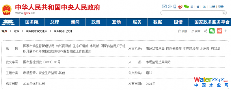 國家市場監(jiān)督管理總局 自然資源部 生態(tài)環(huán)境部 水利部 國家藥監(jiān)局關(guān)于組織開展2021年度檢驗檢測機構(gòu)監(jiān)督抽查工作的通知