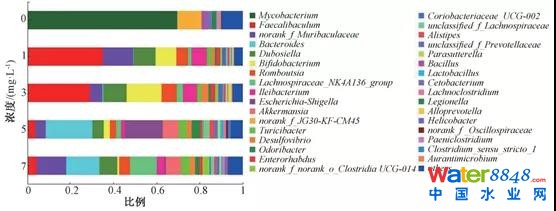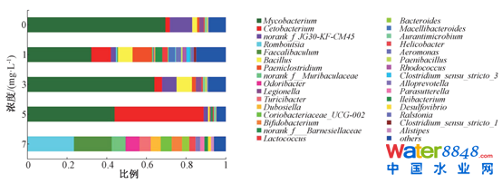 2.3 對(duì)活性污泥微生物群落的影響采用高通量測(cè)序得到的序列劃分OTU后,利用Blastn將OTU序列與對(duì)應(yīng)數(shù)據(jù)庫進(jìn)行比對(duì),篩選出OTU序列的最佳比對(duì)結(jié)果,并對(duì)比對(duì)結(jié)果進(jìn)行過濾,默認(rèn)滿足相似度>90%且Coverage>90%的序列被用來后續(xù)分類,不滿足條件的序列則被歸為unclassified。投加游離氯后,活性污泥中屬水平的微生物組成和相對(duì)豐度如圖8所示。1 mg/L試驗(yàn)組中的優(yōu)勢(shì)菌屬為分支桿菌屬(Mycobacterium)、Cetobacterium和芽孢桿菌屬(Bacillus),相對(duì)豐度分別為32.26%、9.85%和7.70%;3 mg/L試驗(yàn)組中的優(yōu)勢(shì)菌屬為分支桿菌屬(Mycobacterium)、norank_f__JG30-KF-CM45、芽孢桿菌屬(Bacillus),相對(duì)豐度分別為64.05%、7.29%和7.30%;5 mg/L試驗(yàn)組中的優(yōu)勢(shì)菌屬為分支桿菌屬(Mycobacterium)、Cetobacterium和芽孢桿菌屬(Bacillus),相對(duì)豐度分別為43.96%、44.88%和0.76%;7 mg/L試驗(yàn)組中的優(yōu)勢(shì)菌屬為Romboutsia和糞桿菌(Faecalibaculum),相對(duì)豐度分別為23.51%和19.02%。其中,隨著游離氯投加量的增加,芽孢桿菌屬(Bacillus)的相對(duì)豐度呈現(xiàn)下降的趨勢(shì)。