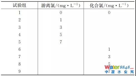 1.2 方法在編號(hào)1~9的反應(yīng)器中分別裝入3 L污泥混合液,模擬生物處理系統(tǒng)。取污水處理廠沉砂池出水,添加一定量游離氯(次氯酸鈉)和化合氯(氯胺T),模擬污水處理廠受到的余氯進(jìn)水沖擊情況,配水濃度見表1。每個(gè)試驗(yàn)組設(shè)置3個(gè)平行組。