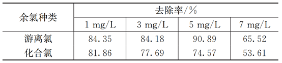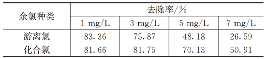 投加游離氯時(shí),活性污泥對(duì)COD的去除率為65.52%~90.89%,隨游離氯投加濃度的增加呈現(xiàn)先增加后降低的趨勢(shì);投加化合氯的活性污泥對(duì)COD去除率為5361%~81.86%,隨化合氯投加濃度的增加而降低。當(dāng)游離氯和化合氯的投加濃度為7 mg/L時(shí),活性污泥對(duì)COD去除率達(dá)到最小值。且在相同投加濃度下,化合氯對(duì)活性污泥去除COD的影響比游離氯大(見表2)。 表2 在不同余氯下活性污泥對(duì)COD的去除率