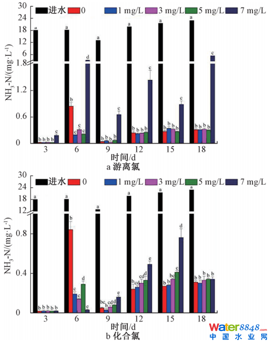 試驗(yàn)期間,進(jìn)水NH3-N的值為12.93~22.78 mg/L。投加游離氯濃度為0、1 mg/L、3 mg/L和5 mg/L時(shí),活性污泥出水的NH3-N值無顯著性差異(第3天P>005;第6天P>0.05;第9天P>0.05;第12天P>0.05;第15天P>0.05;第18天P>0.05);但投加游離氯濃度為7 mg/L的活性污泥出水NH3N(0.18~5.27 mg/L)顯著高于其他濃度的出水(P<0.05,見圖4a)。投加化合氯時(shí),不同濃度化合氯出水的NH3-N值在第3天(0.02 mg/L)和第18天(0.28~0.35 mg/L)無顯著性差異(P>0.05);在第9天、第12天和第15天,活性污泥出水的NH3-N值隨著化合氯投加濃度的增加而上升,并在7 mg/L的投加濃度下達(dá)到最大(P<0.05,見圖4b)。