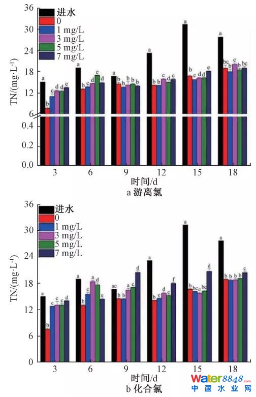 試驗(yàn)期間,進(jìn)水TN的值為15.01~31.31 mg/L。除第9天外,投加1 mg/L濃度游離氯的活性污泥出水TN值(10.93~17.92 mg/L)顯著低于3 mg/L(12.51~20.00 mg/L)、5 mg/L(12.37~18.47 mg/L)和7 mg/L(13.41~16.49 mg/L)(P<005);投加游離氯濃度為3 mg/L、5 mg/L和7 mg/L時(shí),活性污泥出水的TN值沒有呈現(xiàn)一定的規(guī)律(見圖5a)。除第6天外,投加7 mg/L濃度化合氯的活性污泥出水TN值(14.05~20.73 mg/L)顯著高于其他投加化合氯的出水TN(見圖5b)。
