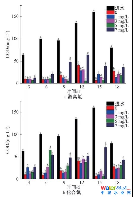 試驗(yàn)期間,進(jìn)水COD的值為63~160 mg/L。未投加游離氯的活性污泥出水COD值為7~41 mg/L,投加1 mg/L游離氯的活性污泥出水COD值為9~29 mg/L,3 mg/L游離氯的出水COD值為9~31 mg/L,5 mg/L游離氯的出水COD值為5~18 mg/L,7 mg/L游離氯的出水COD值為12~64 mg/L。投加7 mg/L游離氯的活性污泥出水COD值均顯著高于其他濃度游離氯(P<0.05),但0、1 mg/L、3 mg/L和5 mg/L游離氯的活性污泥出水COD在試驗(yàn)期間沒有表現(xiàn)出一定的差異規(guī)律(見圖2a)。當(dāng)投加余氯為化合氯時(shí),投加7 mg/L化合氯的活性污泥出水COD值在第9天至第18天為43~71 mg/L,顯著高于其他濃度化合氯(P<0.05);投加5 mg/L化合氯的出水COD值在第6天為65 mg/L,顯著高于其他濃度化合氯(P<0.05,見圖2b)。
