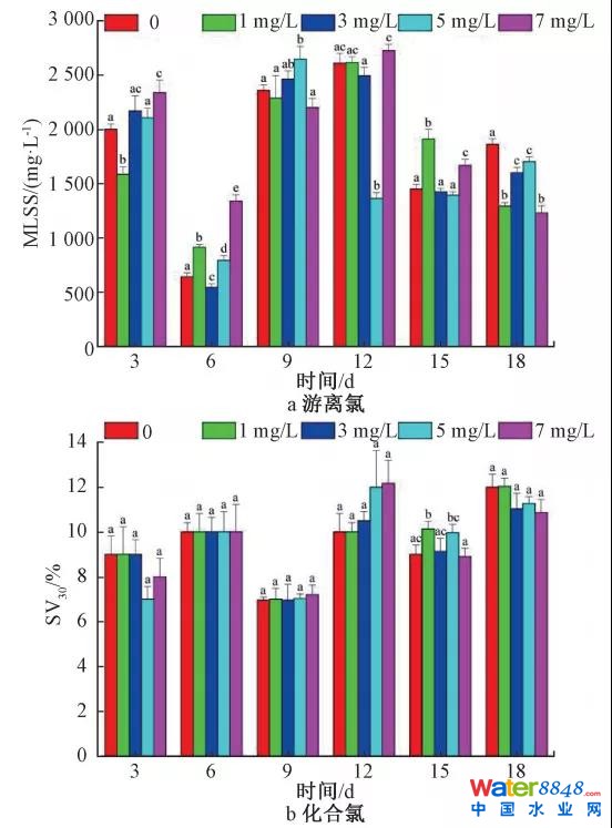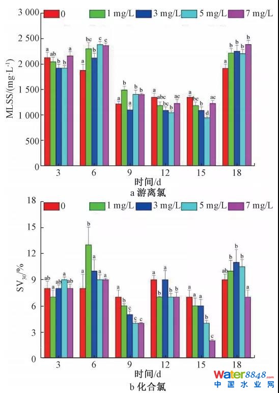 研究指出,進(jìn)水余氯大于0.05 mg/L時(shí),應(yīng)立即對(duì)污泥進(jìn)行監(jiān)測(cè)。本試驗(yàn)投加游離氯后,活性污泥的MLSS隨著時(shí)間的推移呈現(xiàn)先下降再上升后下降的現(xiàn)象;但在相同的時(shí)間點(diǎn),不同投加濃度中活性污泥的MLSS和SV30差異也不存在一定規(guī)律(見圖7)。說明在投加游離氯和化合氯的情況下,活性污泥的沉降性能良好。