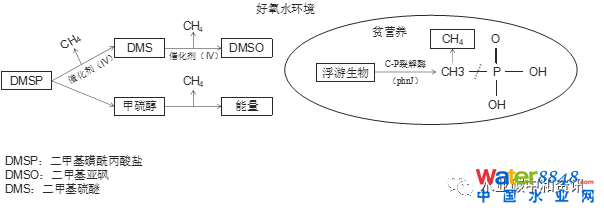 有悖于傳統(tǒng)觀念中厭氧底泥CH4釋放,這種在好氧環(huán)境下CH4過(guò)量釋放的現(xiàn)象被學(xué)界稱(chēng)之為“甲烷悖論”,其產(chǎn)生機(jī)理如下圖所示。以藻類(lèi)代謝物二甲基磺酰丙酸鹽(DMSP)及其降解產(chǎn)物甲硫醇、二甲基硫醚(DMS)、二甲基亞砜(DMSO)等作為底物,在有氧環(huán)境下可以產(chǎn)生CH4的“假說(shuō)”已被證實(shí)。另外一項(xiàng)最新研究稱(chēng),一種微生物酶可讓甲基磷酸脂(MPn)在脫去磷酸酯分子過(guò)程中生成CH4,這也為解釋地表水體甲烷悖論現(xiàn)象提供了理論根據(jù)。