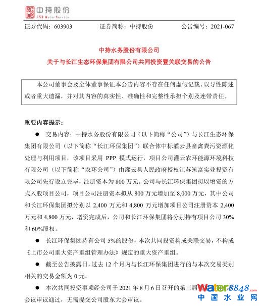 中持股份與長(zhǎng)江環(huán)保集團(tuán)共參投農(nóng)環(huán)公司 以進(jìn)行灌云縣畜禽糞污資源化處理與利用項(xiàng)目
